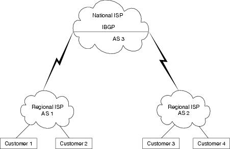 The Border Gateway Protocol (BGP) is an interautonomous system routing protocol. An autonomous system is a network or group of networks under a common administration and with common routing policies. BGP is used to exchange routing information for the Internet and is the protocol used between Internet service providers (ISP). Customer networks, such as universities and corporations, usually employ an Interior Gateway Protocol (IGP) such as RIP or OSPF for the exchange of routing information within their networks. Customers connect to ISPs, and ISPs use BGP to exchange customer and ISP routes. When BGP is used between autonomous systems (AS), the protocol is referred to as External BGP (EBGP). If a service provider is using BGP to exchange routes within an AS, then the protocol is referred to as Interior BGP (IBGP). Figure 39-1 illustrates this distinction.