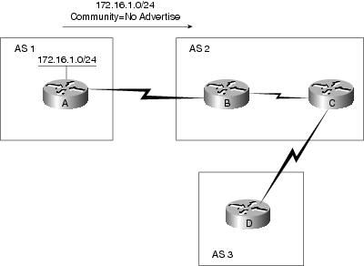 In Figure 39-8, AS 1 advertises 172.16.1.0 to AS 2 with the community attribute no-advertise. Router B in AS 2 will not advertise this route to any other router.